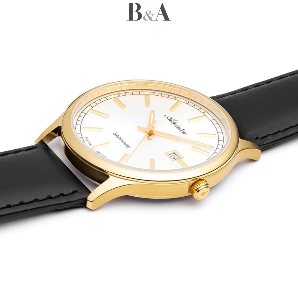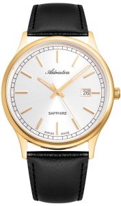 Zegarek męski Adriatica A1293.1213Q z tarczą koloru srebrnego. Koperta wykonana została ze złoconej stali szlachetnej najwyższej jakości, którą połączono z czarnym paskiem ze skóry. Model ten posiada szafirowe nie rysujące się szkło oraz 30m wodoszczelność. Dodatkowo na tarczy znajduje się datownik na godzinie trzeciej.