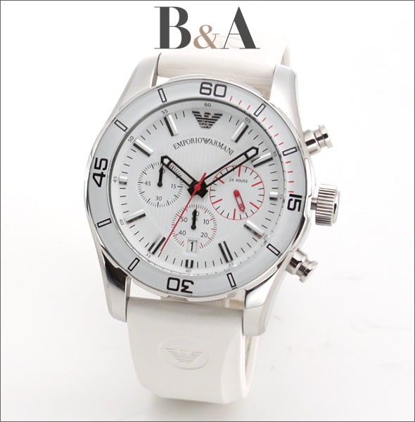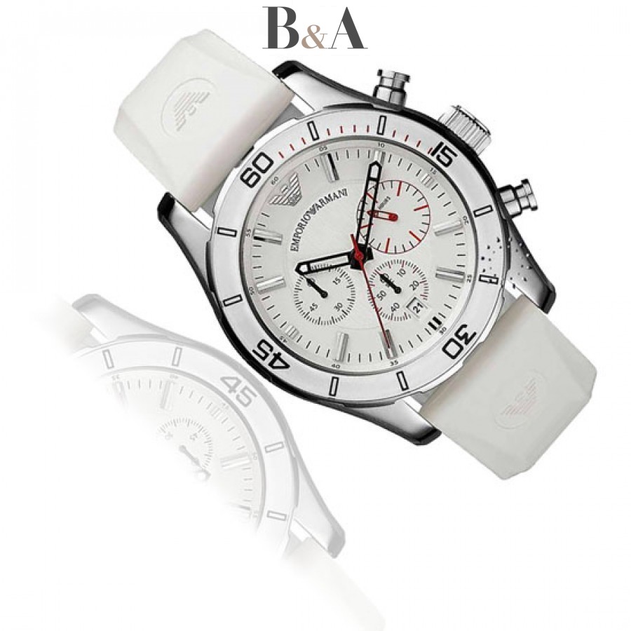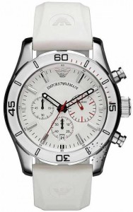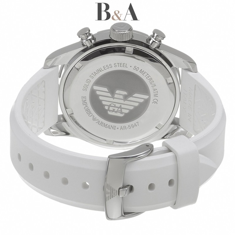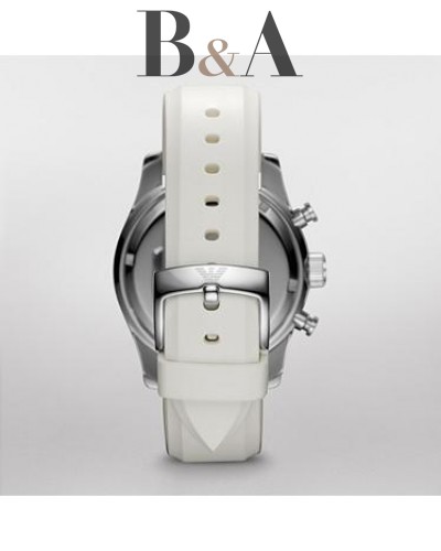 Biały pasek silikonowy, biała tarcza z chronografem, datownik na godzinie szóstej, 50 metrowa wodoszczelność oraz 2-letnia gwarancja AR5947
