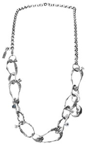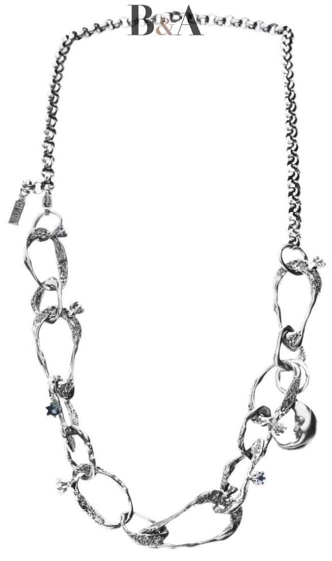 Efektowny srebrny naszyjnik został zaprojektowany i wykonany w naszej pracowni Motyle z największą dbałością o każdy szczegół. Masywny naszyjnik to kompozycja nieregularnych ogniw łańcuchowych w połączeniu z delikatnymi błękitnymi kamieniami w oprawach przypominających gwiazdy. Delikatnym przyciągającym uwagę akcentem jest umieszczony księżyc wyznaczający środek naszyjnika.