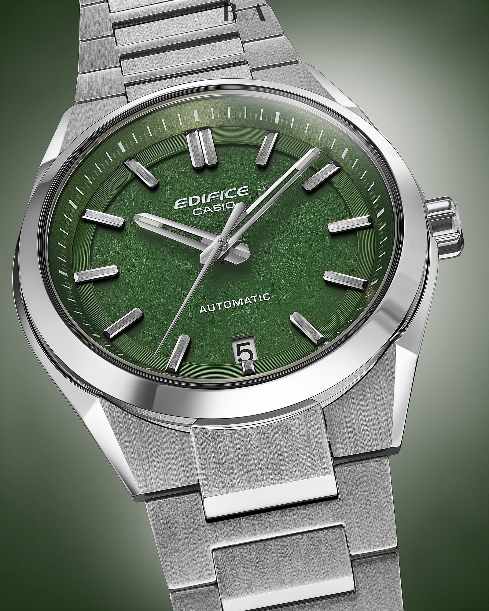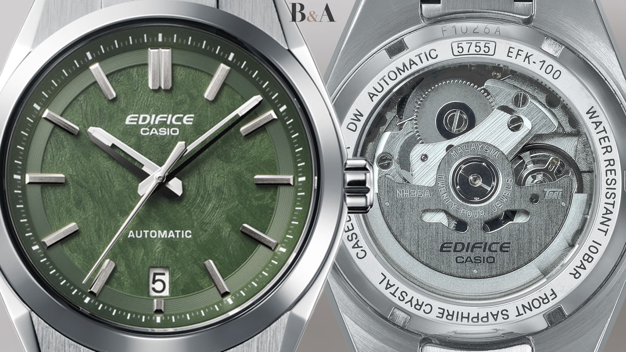 Casio Edifice EFK-100D-3AER otwiera nowy rozdział w historii marki – to pierwszy w pełni mechaniczny Edifice z automatycznym naciągiem i duszą prawdziwego czasomierza. Zbudowany wokół niezawodnego mechanizmu Seiko NH35A, zamknięty w stalowej kopercie o proporcjach idealnych i podkreślony zieloną tarczą z teksturą forged carbon – to zegarek, który nie goni trendów. On je tworzy.