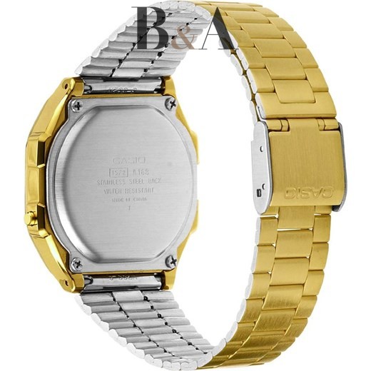 Casio A168WG-9EF przyciąga wzrok swoim eleganckim, złotym wykończeniem. Koperta oraz bransoleta wykonane są z trwałej stali nierdzewnej, pokrytej złotą powłoką, co nadaje zegarkowi luksusowy wygląd. Tarcza zegarka, utrzymana w złotej kolorystyce, współgra z całością, tworząc spójny i stylowy design. Prostokątna koperta nawiązuje do klasycznego stylu lat 80., dodając zegarkowi niepowtarzalnego charakteru retro.