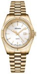 Tarcza zegarka utrzymana jest w eleganckim srebrnym kolorze, z wyraźnymi złotymi indeksami godzinowymi i delikatnymi wskazówkami. Minimalistyczny design tarczy podkreśla luksusowy charakter zegarka, a dodatkowym atutem jest subtelny datownik umieszczony na godzinie 3, który zwiększa funkcjonalność zegarka.