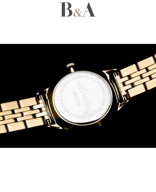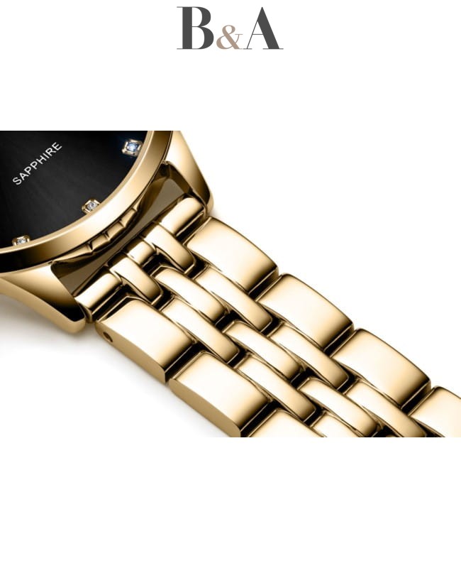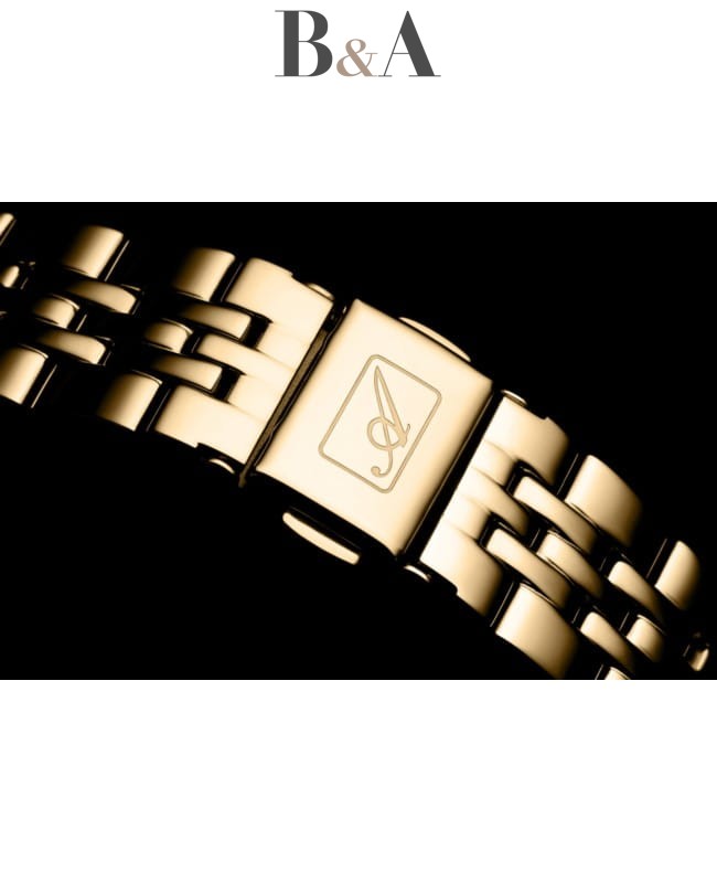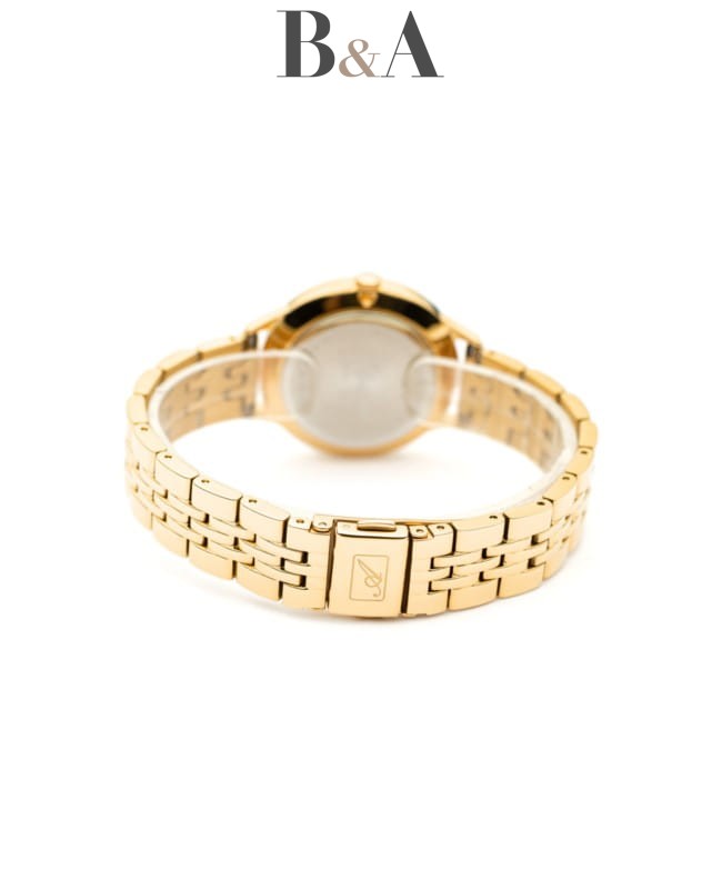Zegarek wyposażony jest w złotą bransoletę wykonaną ze stali nierdzewnej, która doskonale komponuje się z kopertą zegarka. Bransoleta jest nie tylko stylowa, ale również wygodna w noszeniu, zapewniając pewne zapięcie i łatwość zakładania oraz zdejmowania. Szerokość bransolety wynosi 14 mm, co sprawia, że zegarek prezentuje się subtelnie i elegancko na nadgarstku.