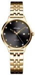 Koperta zegarka wykonana jest z wysokiej jakości stali nierdzewnej pokrytej złotem, co nadaje mu elegancji i trwałości. Średnica koperty wynosi 32 mm, co sprawia, że zegarek jest doskonałym dodatkiem na każdą okazję. Czarna tarcza z wyrazistymi złotymi indeksami i wskazówkami stanowi elegancki kontrast, który dodaje zegarkowi wyjątkowego charakteru. Dodatkowym atutem jest okienko datownika umieszczone na godzinie 3, które podnosi funkcjonalność zegarka.