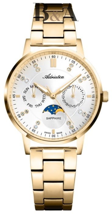 Adriatica A3834.1193QF posiada solidną kopertę wykonaną z nierdzewnej stali szlachetnej, pokrytej złotą powłoką, co dodaje jej wyjątkowego blasku. Średnica koperty wynosi 34 mm, co sprawia, że zegarek jest doskonale widoczny i prezentuje się elegancko na nadgarstku. Szkło szafirowe, które chroni tarczę, jest odporne na zarysowania, co gwarantuje długotrwałą estetykę zegarka.