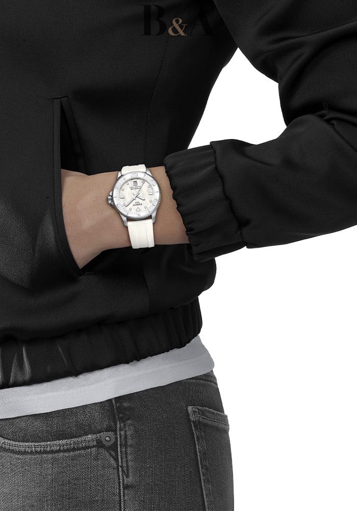 Odkryj podwodny świat razem z Tissot. Zanurz się w głębinach krystalicznie czystej wody gdzie panuje błoga cisza, a przez powierzchnię przebijają promienie słoneczne. Jesteś przepełniony spokojem i z uważnością eksplorujesz podwodny świat, a na swoim nadgarstku masz Tissot Seastar 1000 Quartz, który otwiera Ci drzwi do tego morskiego świata. Nowa, mniejsza (36 mm) koperta zapewnia tę samą niezawodność co poprzednia wersja. Tissot Seastar to zegarek, który jest nie tylko zachwycający ze względu na swój design, ale przede wszystkim wszechstronność. Z tym zegarkiem możesz korzystać ze wszystkich wodnych aktywności, ale także przemierzać miejską dżunglę. Tissot Seastar z nowym, mniejszym rozmiarem koperty jest dostępny w 3 kolorach tarczy: czarnym, niebieskim oraz białym. Koperta i bransoleta każdego z nich została wykonana ze stali nierdzewnej, przy czym model z białą tarczą oferowany jest z białym, silikonowym paskiem w zestawie. Tissot Seastar posiada obrotowy pierścień koperty, odporne na zarysowania wypukłe szkło szafirowe z dwustronną powłoką antyrefleksyjną, zakręcaną koronkę oraz wodoszczelność do 30 barów (300 m / 1000 stóp). W każdym z modeli możesz w szybki i łatwy sposób wymienić stalową bransoletę na silikonowy pasek, który dostępny jest na naszej stronie w jednym z 3 kolorów (pomarańczowym, jasnoniebieskim i czarnym).