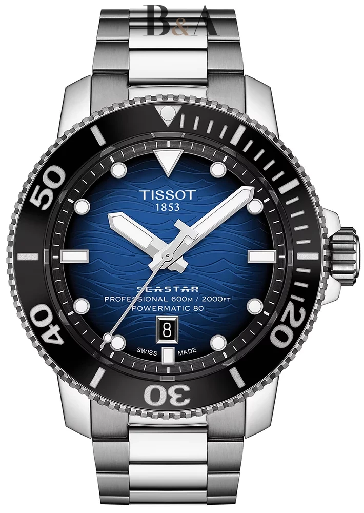 Niezawodność nawet w ekstremalnych warunkach i niezapomnianych przygodach, gdziekolwiek tylko zechcesz zapewni Ci Tissot Seastar 2000 Professional Powermatic 80. Zaawansowany technicznie zegarek, który sprawdzi się w każdych warunkach użytkowania, niezależnie od tego, czy zabierzesz go w podróż po miejskiej dżungli, czy setki metrów pod powierzchnię wody. Dzięki eleganckiemu i stylowemu designowi jest to uniwersalny zegarek, który możesz nosić na co dzień. Jego zaawansowanie techniczne gwarantuje wodoodporności do 60 barów (600 m / 2000 stóp) co potwierdza posiadanie przez ten model certyfikatu zegarka nurkowego z normą ISO 6425 (2018). Tissot Seastar posiada obrotowy pierścień koperty, zakręcaną koronkę, automatyczny zawór helowy oraz wodoodporny pasek z czarnej gumy i niebieskiego materiału. Motyw fal na czarnej lub gradientowej tarczy nawiązuje do niezwykłych walorów technicznych tego nurkowego modelu ale także podkreśla jego niesamowite piękno.