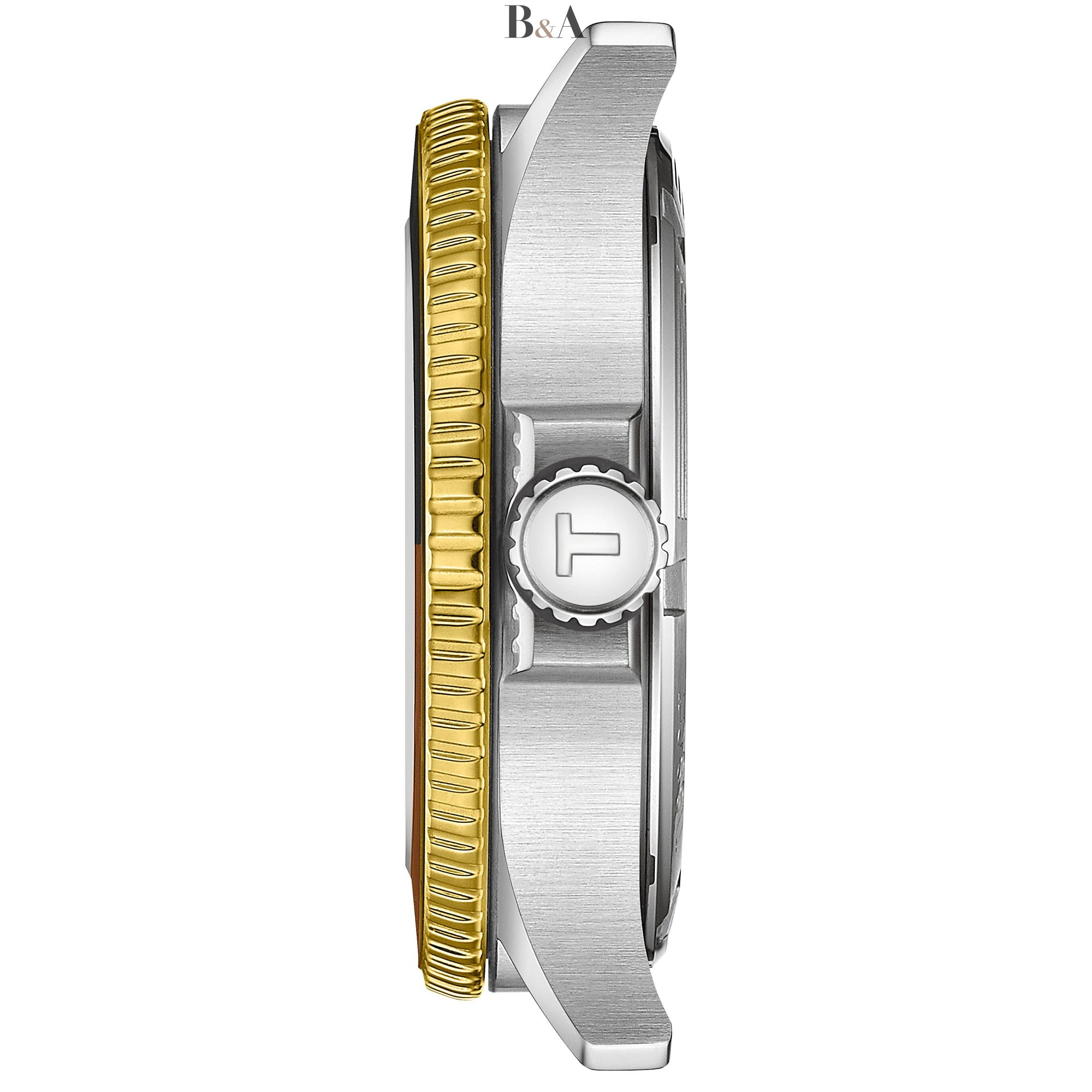 Koperta o średnicy 40 mm wykonana została z wysokiej jakości stali szlachetnej 316L, pokrytej powłoką PVD w kolorze żółtego złota, co nadaje zegarkowi luksusowego charakteru. Czarna tarcza z wyrazistymi indeksami i wskazówkami pokrytymi Super-LumiNova® zapewnia doskonałą czytelność w każdych warunkach – zarówno w ciemności, jak i pod wodą. Dwukolorowa bransoleta stalowo-złota dopełnia całości, tworząc harmonijną kompozycję sportowej elegancji.