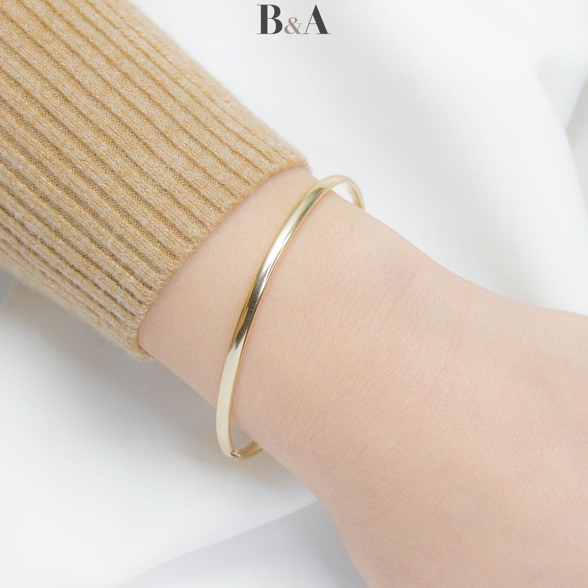 Wykonana z wysokiej jakości żółtego złota próby 585, zachwyca gładkim wykończeniem i delikatną formą, która pięknie układa się na nadgarstku. Jej klasyczny, półokrągły kształt oraz subtelna szerokość tworzą idealne połączenie prostoty i elegancji. Bransoletka doskonale sprawdza się zarówno jako samodzielna ozdoba, jak i w zestawieniu z inną biżuterią – zegarkiem lub drobnymi łańcuszkami.